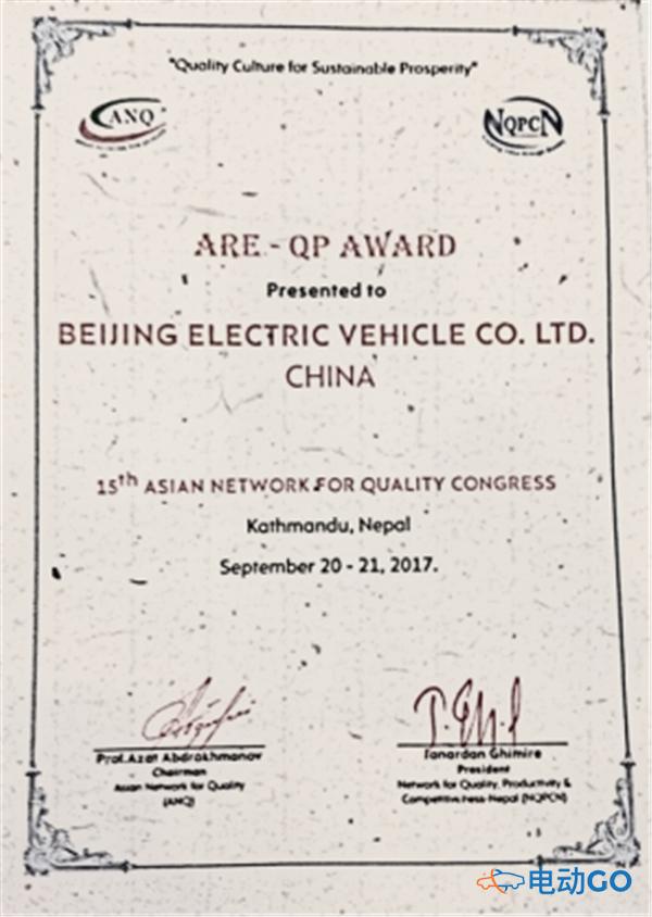 北汽新能源获亚洲质量网颁发的亚洲质量卓越奖