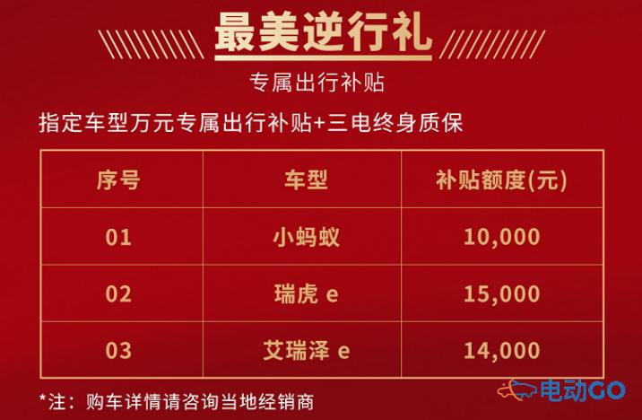 疫情当前,交通受限,减少接触,依旧是防疫狙击战的关键所在。奇瑞新能源充分考虑到用户用车需求,专门推出了价格补贴,从根本上降低购车门槛。购买今年隆重上市的2019款小蚂蚁、瑞虎e、艾瑞泽e这三款明星指定车型,即可享受10000元—15000元价格不等的购车补贴,为防疫工作者出行提供便利。