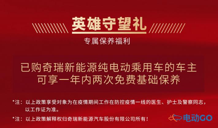 值得一提的是,防疫英雄们在享受本次专属感恩政策的同时享受三电终身质保政策:这三款车型的首任非营运车主,都可以享受奇瑞新能源提供的包括动力电池(电芯)、驱动电机(含电机控制器)、整车控制器终身质保服务,为用户提供优惠实在的贴心服务,从实际出发解决用户的使用焦虑,实现全生命周期的用心呵护和贴心陪伴。