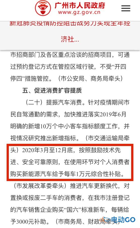 3月3日,广州市人民政府对外印发《广州市坚决打赢新冠肺炎疫情防控阻击战努力实现全年经济社会发展目标任务的若干措施》(简称“《措施》”)。其中提到鼓励新能源购车的重要政策——“2020年3月至12月底,对个人消费者购买新能源汽车作出最高享受1万元补贴。”