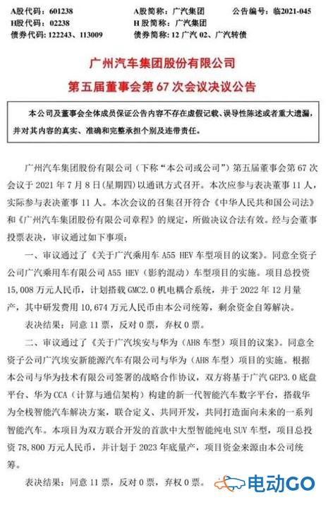 7月9日,广汽集团发布公告称,同意全资子公司广汽埃安新能源汽车有限公司与华为(AH8车型)项目的实施,后续双方将联合开发首款中大型智能纯电SUV车型,并计划于2023年底量产。根据此前广汽与华为签署的战略合作协议,双方将基于广汽GEP3.0底盘平台、华为CCA(计算与通信架构)构建的新一代智能汽车数字平台,搭载华为全栈智能汽车解决方案,联合定义、共同开发,共同打造面向未来的一系列智能汽车。