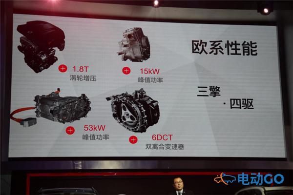动力搭载一台1.8T涡轮增压发动机、一台前置助力电机以及一台后驱电机,可提供纯电驱动、发动机驱动、串联驱动及并联驱动四种模式切换,0-100km/h加速时间在7.9秒内。