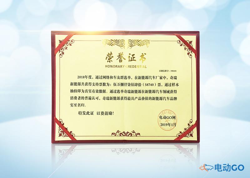 2019年1月,电动GO网联合国内最大的新能源车主群举办“年度新能源汽车评选盛典”,在北京盛大落幕。本次评选盛典采用网友和群友投票的形式进行评选,最终奇瑞新能源凭借用户的良好口碑与喜爱,斩获“最具品牌价值奖”,赢得了众多消费者的认同。