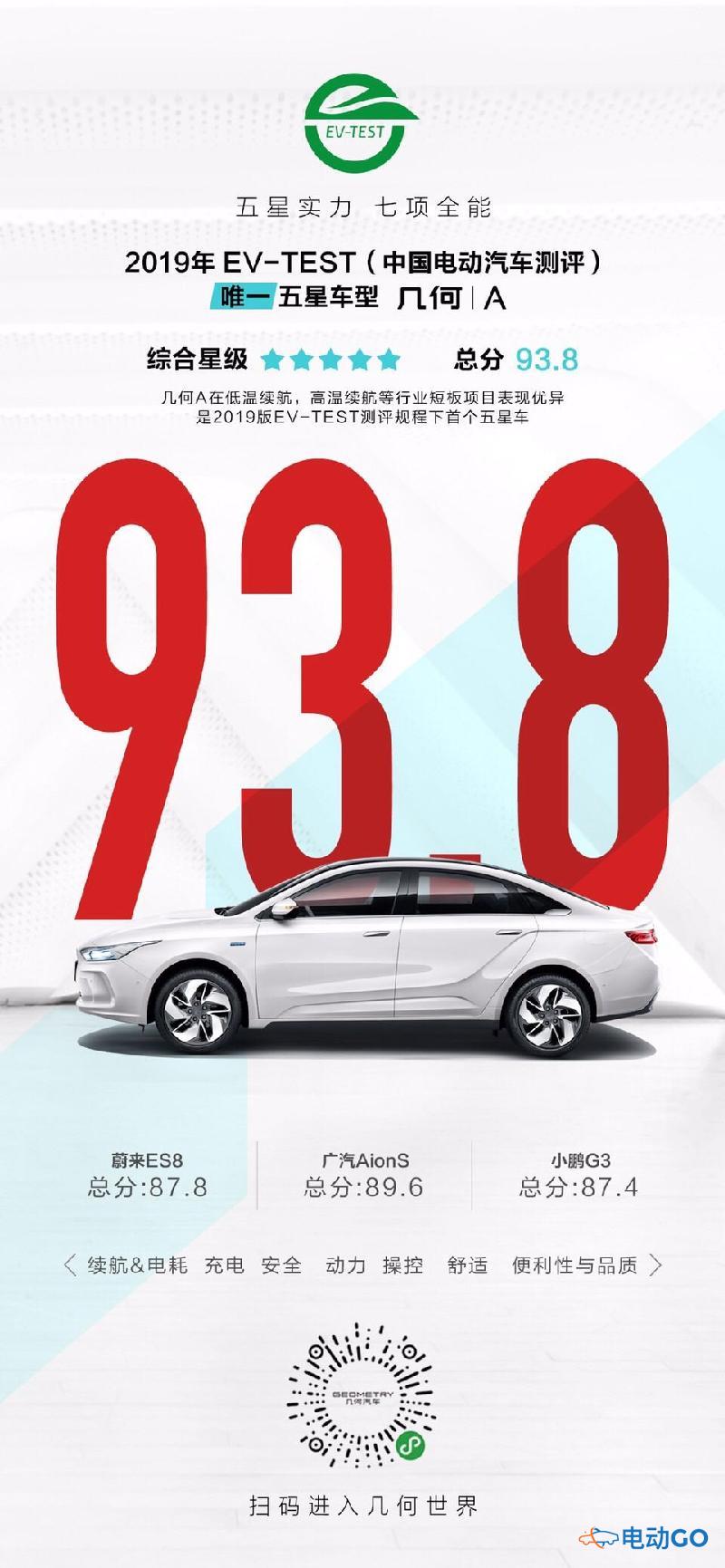 “两年7折 超值回购”活动消除了消费者对几何A的保值率焦虑,几何A天生的真续航能力则解决了消费者对纯电动车的另一大痛点——续航里程焦虑。由中国汽车技术研究中心发布的2019年第二批EV-TEST的评测结果显示,几何A以93.8分的成绩获得5星评价,成为EV-TEST新规下首款获得5星评价的纯电动车。在“续航与电耗”测评项中,几何A更以97.5分的高分一骑绝尘,这也验证着几何A“真续航,不打折”的超长续航能力。