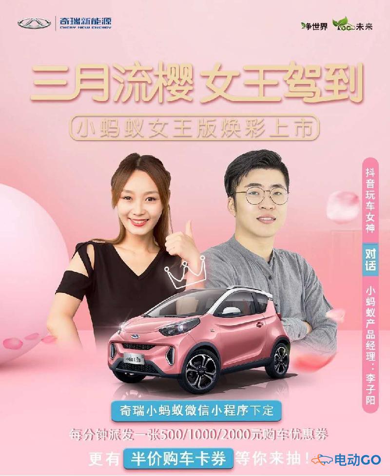 3月25日,“三月流樱 女王驾到 小蚂蚁女王版焕彩上市”暨首届奇瑞小蚂蚁云上购车节直播购车活动成功举行。整场直播2.5小时,在线人数累计达56.8万人,并以258辆订单的战绩再次掀起热潮。更值得一提的是,我们还一起见证了小蚂蚁女王版的心动上市,全新流樱粉车身颜色搭配粉米色内饰设计与春暖花开的三月相得映彰,更有Easy-Entry电动座椅等舒适智能配置,为用户提供更高品质的出行生活。