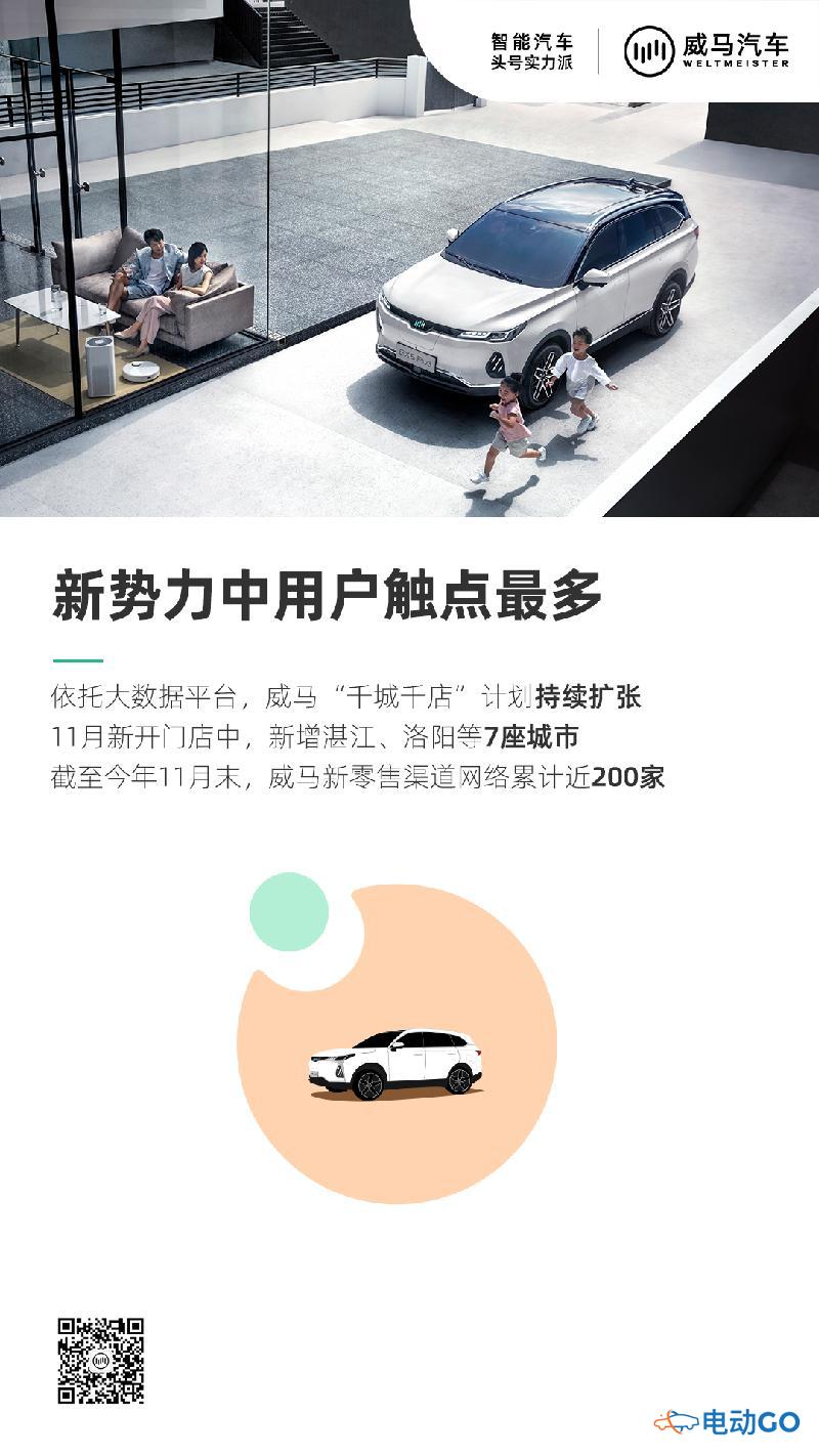 截至今年11月末,威马新零售渠道网络累计近200家,成为造车新势力中用户触点布局最多、最广的车企