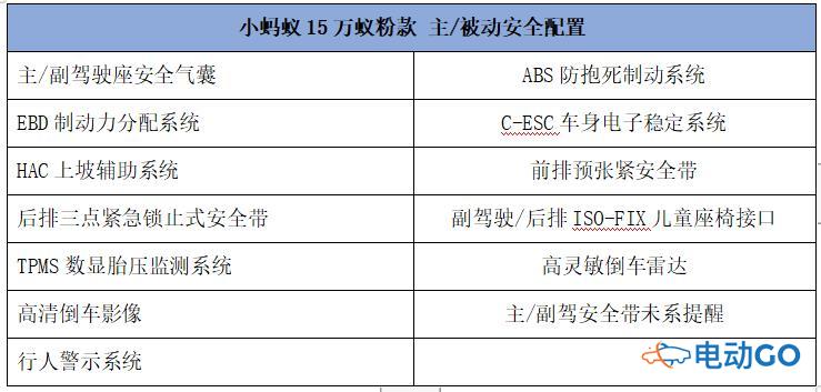 除了安全的车身结构、三电系统之外,小蚂蚁15万蚁粉款在主/被动安全配置方面同样具备领先的优势。相比于市场上有些连安全气囊都没有的微型电动车,小蚂蚁15万蚁粉款全系车型标配了全面、先进的主/被安全配置,充分体现出奇瑞新能源在安全质量问题方面的诚意。