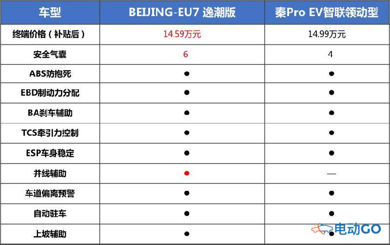 BEIJING-EU7和秦Pro EV均搭载了ABS防抱死、刹车辅助、车道偏离预警系统等驾驶辅助功能,能够防止车辆打滑,提高行车稳定性和安全性。而且,BEIJING-EU7还配备了6安全气囊和并线辅助功能,比后者多了两重防护。
