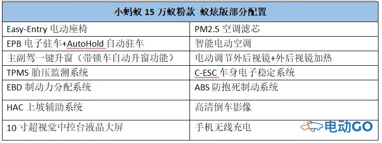 “蚂蚁虽小,五脏俱全”,小蚂蚁15万蚁粉款价优物更美,从舒适性配置到安全、智能配置应有尽有。以小蚂蚁15万蚁粉款蚁炫版(以下简称小蚂蚁15万蚁粉款)为例,在健康舒适性方面,新车配备有Easy-Entry电动座椅,支持一键快速移位+翻折、复位;PM2.5滤芯+远程杀毒,守护车内空气时刻保持清洁、健康;EPB电子驻车+AutoHold自动驻车,智能便捷出行,从容开启都市潮流生活;安全方面的守护就更为全面了,新车除了有五星车身、安全三电之外,主动安全配置上小蚂蚁15万蚁粉款同样出众,C-ESC车身电子稳定系统、HAC上坡辅助系统、TPMS胎压监测系统,为驾乘人员提供更全面、更可靠的品质安全保障。此外,10寸超视觉中控台液晶大屏、手机无线充电等前沿科技配置也都出现在小蚂蚁15万蚁粉款上。