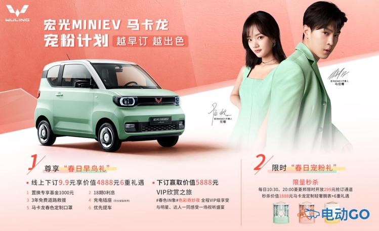 今日起至正式上市,用户通过菱菱邦商城、五菱宝骏天猫及京东旗舰店官方指定线上渠道9.9元下订,就能获得价值4888元的“春日早鸟礼”,包含1000元专享置换补贴、18期0利息、3年免费道路救援、充电插座(符合安装条件)、马卡龙春色定制口罩、优先提车共六重礼遇。期间,官方还开启“春日宠粉礼”限时预订通道,每日10:30、20:00用户可在菱菱邦商城299元限量下订秒杀,可在享受六重礼遇的基础上额外获得价值1888元宏光MINIEV马卡龙定制轻奢腕表。据悉,该腕表来自瑞典轻奢腕饰品牌Daniel Wellington。除此之外,下订用户还有机会赢取价值5888元的色彩奇妙夜VIP欣赏之旅权益。宏光MINIEV马卡龙以丰厚时尚的购车礼遇相赠,可谓诚意十足。