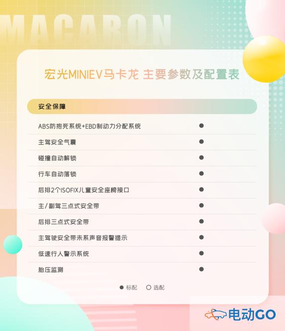 宏光MINEV马卡龙主被动安全配置齐上阵,车身高强度钢比例达到57%,标配主驾安全气囊,实力护航车主安心出行,后排座椅配备2个ISOFIX 儿童安全座椅接口,为车内驾乘人员增添多重保障。此外,新车配备ABS防抱死系统、EBD 制动力分配系统及胎压监测、低速行人警示系统等功能,多项安全配置全方位地展现“小而强大”的硬核实力。