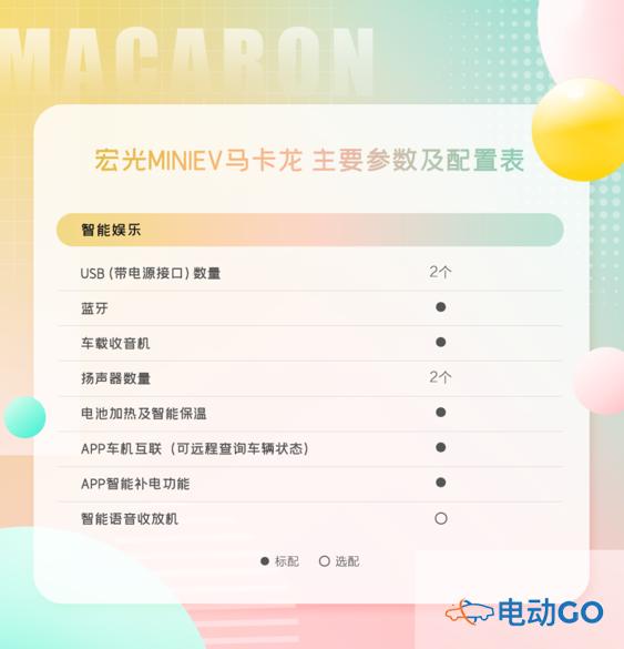 宏光MINIEV马卡龙涵盖多项智娱功能,切合年轻人时尚多元出行需求。中控台按键贴心中文注释,配备全新蓝牙,支持选装“智能语音收放机”,尽享免唤醒语音交互、语音导航等功能。新车还应用电池加热及智能保温技术,免除冬季续航打折焦虑;支持手机远程监测三电系统状态,一键智能补电更快捷高效。